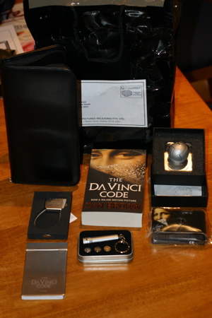 Apparently I was a third prize winner in the Australian version of the Da Vinci Code Quest that Google ran recently. I arrived home today to find a large-ish black bag with rope handles – like a cheap version of the type you get in swanky stores – stuffed into our letterbox. Upon opening it I found a copy of the ‘Da Vinci Code’ book, and a number of other bits and pieces all with Da Vinci Code logos on them, as you can see in this photo: